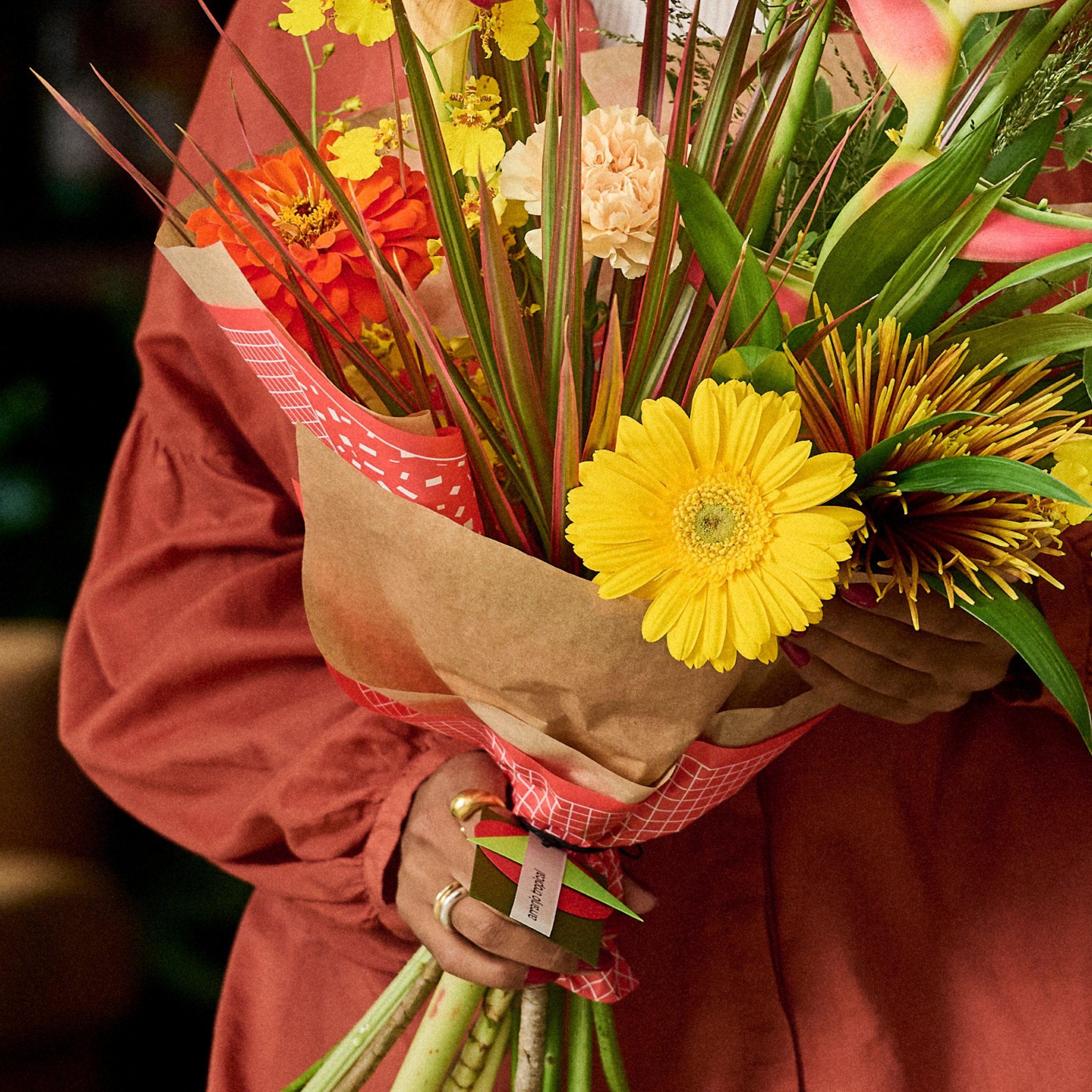 Buquê Solar M – Flores Amarelas e Laranja | Arranjo Tropical