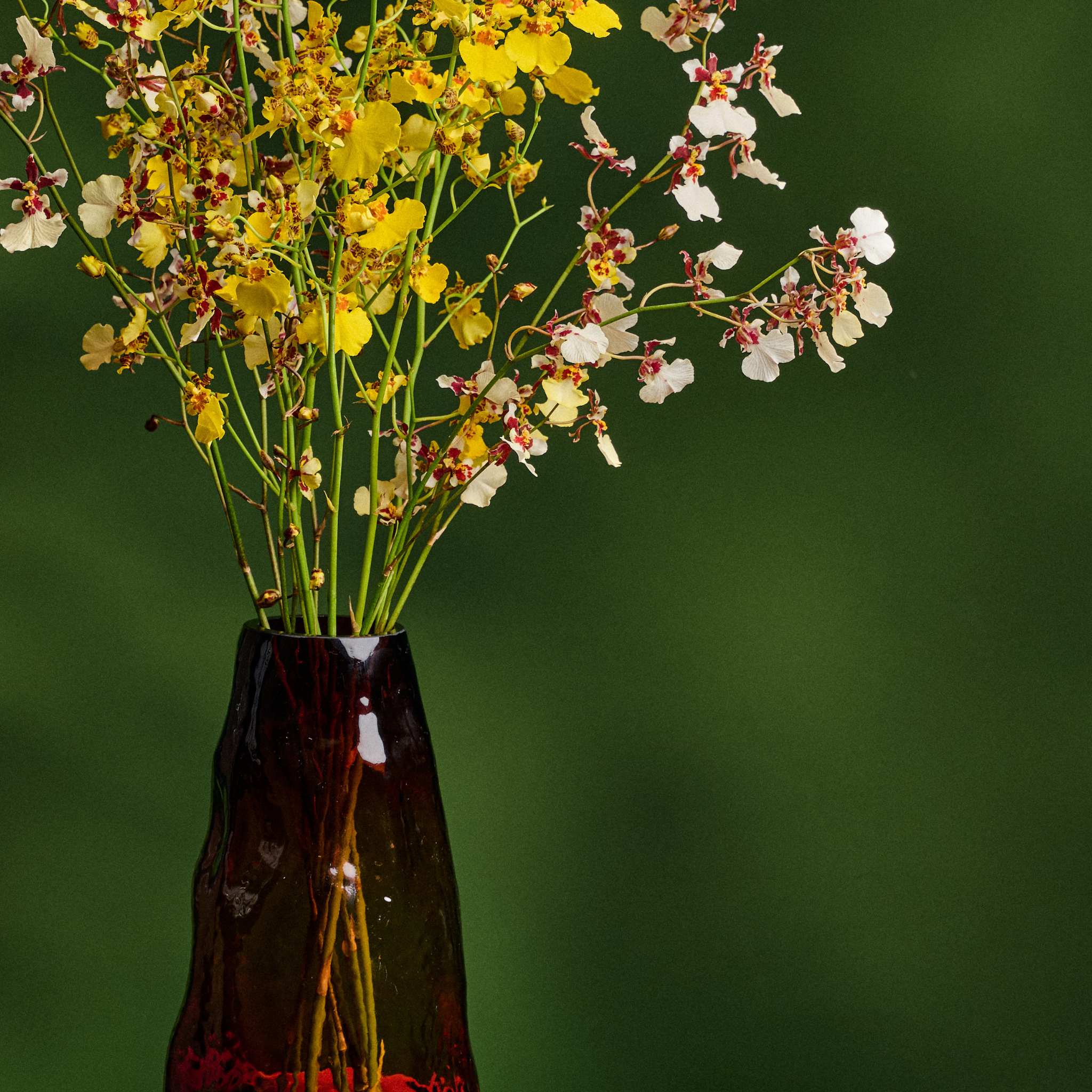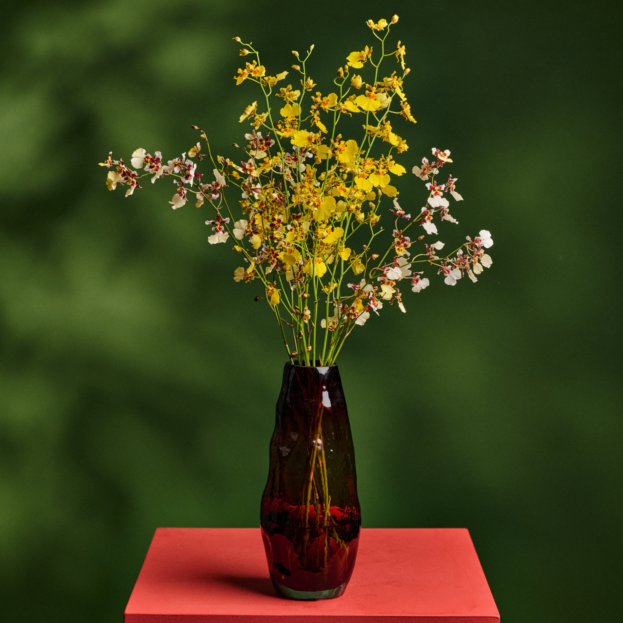 Arranjo com 10 hastes de orquídeas oncidium frescas, selecionadas conforme a disponibilidade do dia. Leve, delicado e cheio de movimento, cada composição pode variar em tons. Acompanha vaso de vidro, que valoriza a fluidez das hastes.