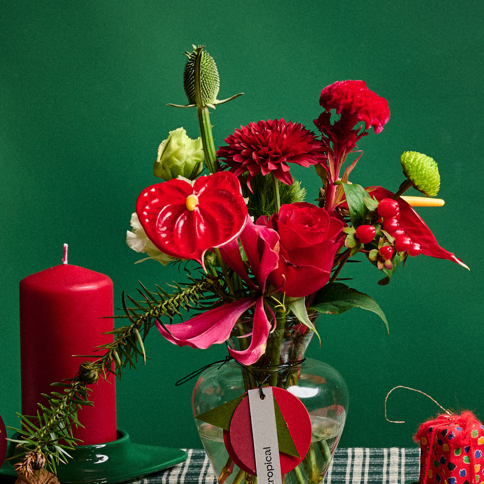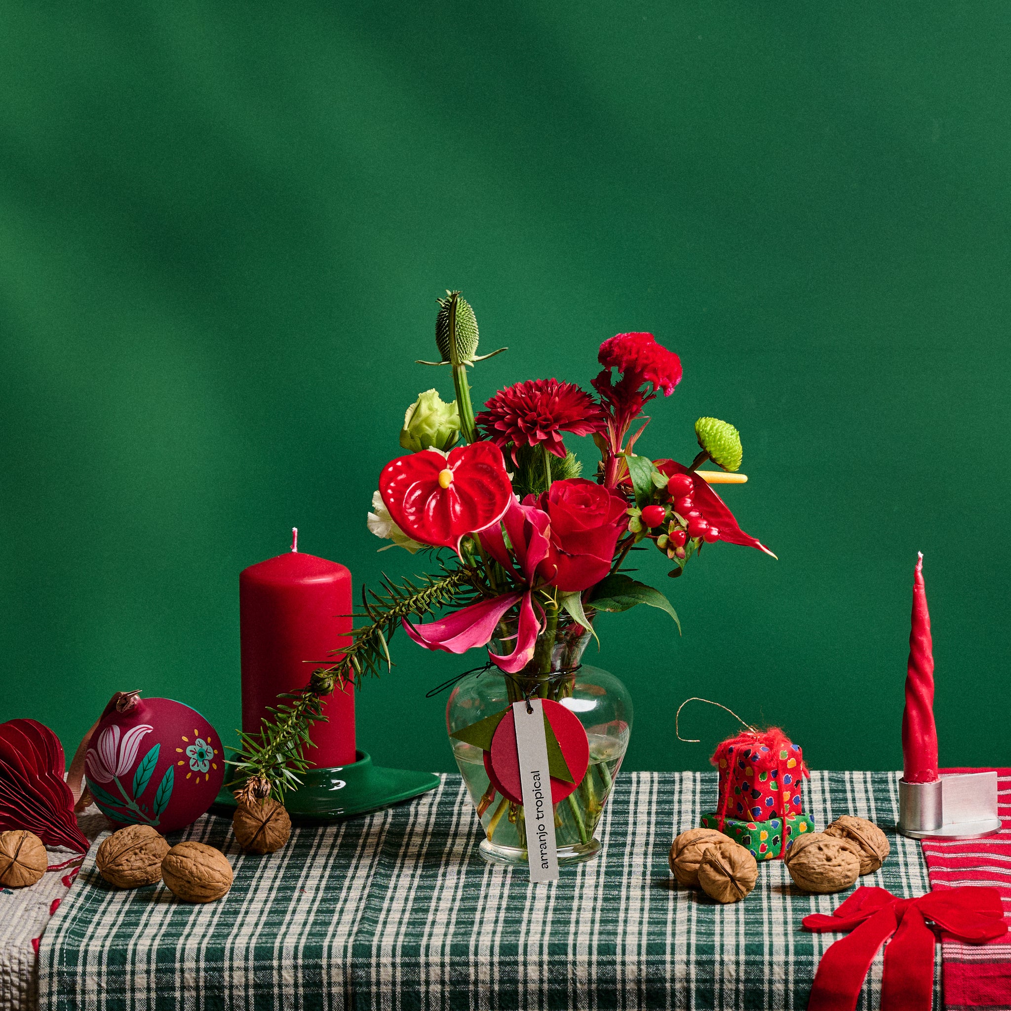 O Arranjo Cereja é um arranjo de flores vermelhas, feito em vaso redondo de vidro pequeno. Ideal para presentear ou decorar cantinhos com um toque natalino, ele combina charme, cor e delicadeza em um tamanho compacto.