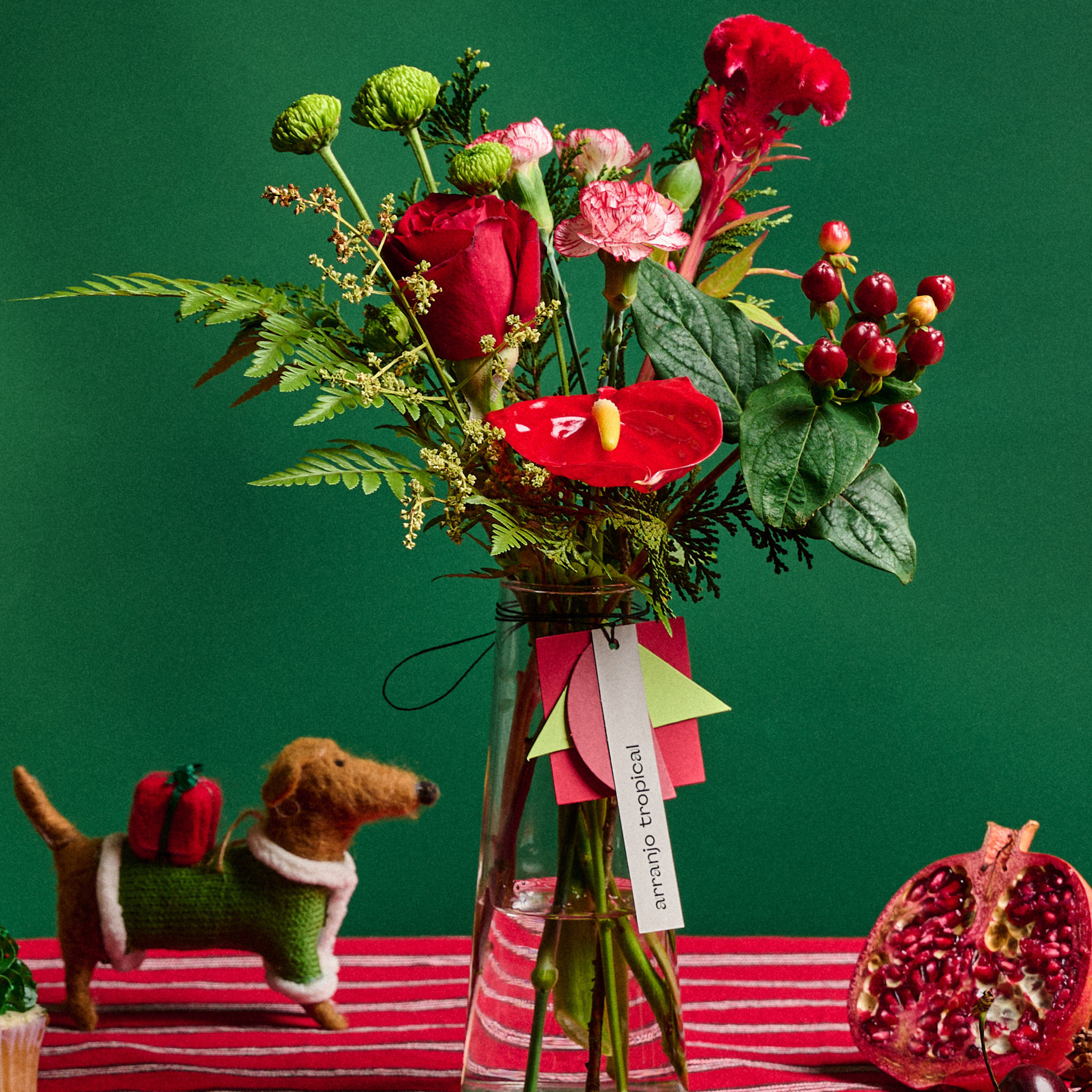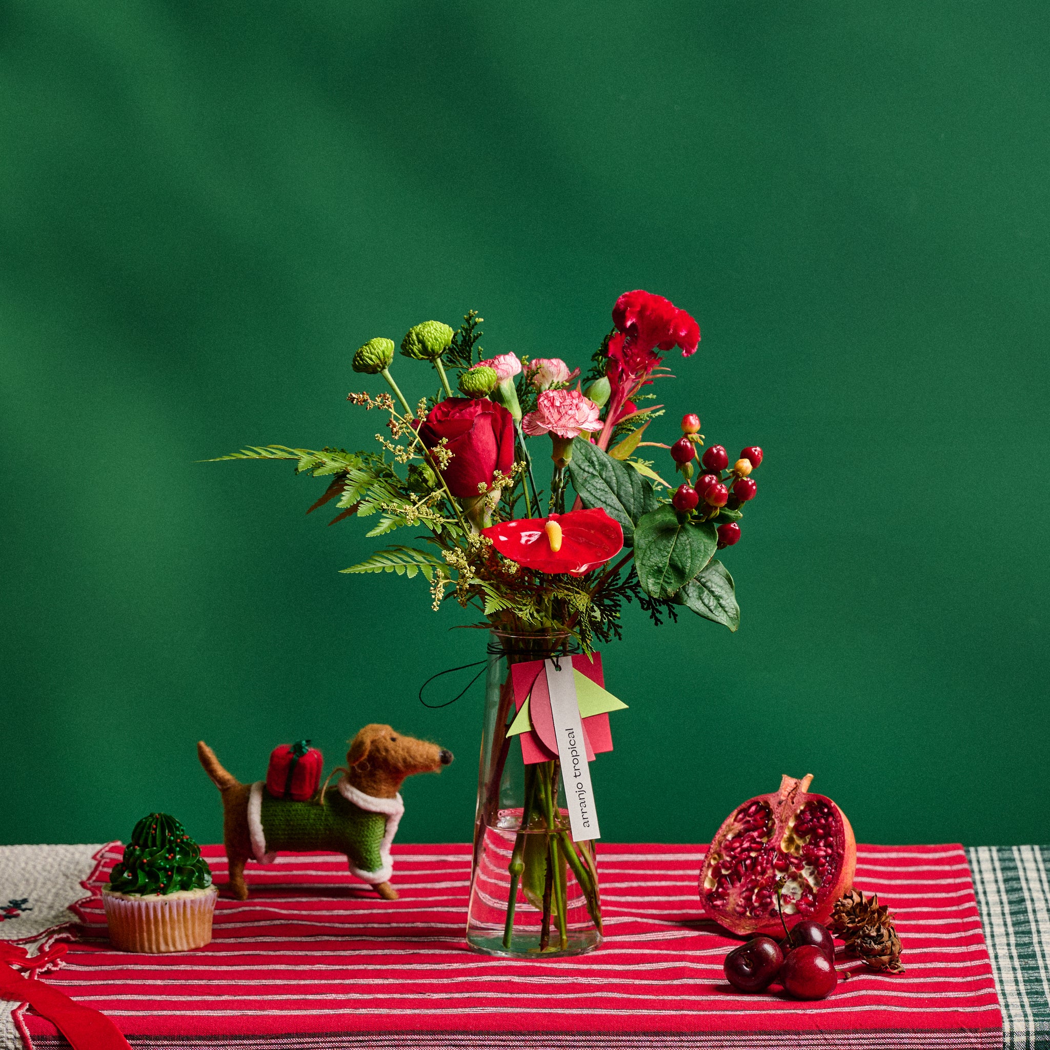 Arranjo de flores em vaso cereja, com tamanho pequeno, e ideal para enfeitar cantinhos neste natal com praticidade e elegancia. Acompanha pequeno vaso de vidro em forma de cone.